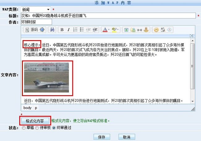 溫馨提示:當(dāng)不需要添加圖片時(shí),我們也建議用戶點(diǎn)擊“格式化內(nèi)容”按鈕,這樣可保證所輸入的內(nèi)容符合WAP規(guī)范的內(nèi)容格式。
