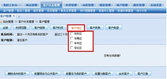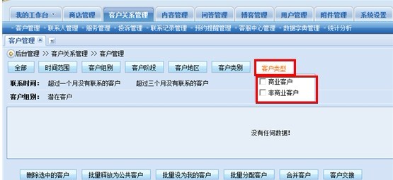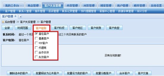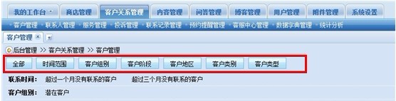 系統(tǒng)后臺(tái)界面客戶管理中,我們可以看到管理列表中有7欄不同的分類,可以按照時(shí)間范圍、客戶組別、客戶階段、客戶地區(qū)、客戶類別、客戶類型、全部客戶等條件進(jìn)行客戶搜索。如圖:
