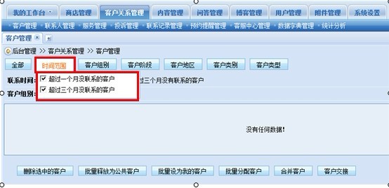如果您想按時(shí)間范圍查找一批客戶資料,那么將鼠標(biāo)停留在“時(shí)間范圍”一欄上,功能鍵下方便會(huì)出現(xiàn)時(shí)間范圍“超過一個(gè)月沒有聯(lián)系的客戶”和“超過三個(gè)月沒有聯(lián)系的客戶”,按照需求點(diǎn)擊相應(yīng)的選項(xiàng),便可查詢到您需要的客戶資料。