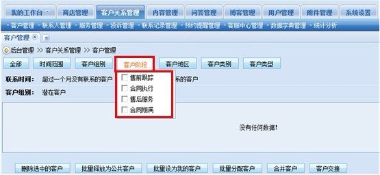 如果您想按客戶階段查找一批客戶資料,那么將鼠標(biāo)停留在“客戶階段”一欄上,功能鍵下方便會(huì)出現(xiàn)相應(yīng)的組別選項(xiàng)“售前跟蹤”、“合同執(zhí)行”、“售后服務(wù)”、“合同期滿”,按照需求點(diǎn)擊相應(yīng)的選項(xiàng),便查詢到您需要的客戶資料了。