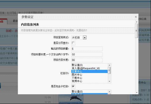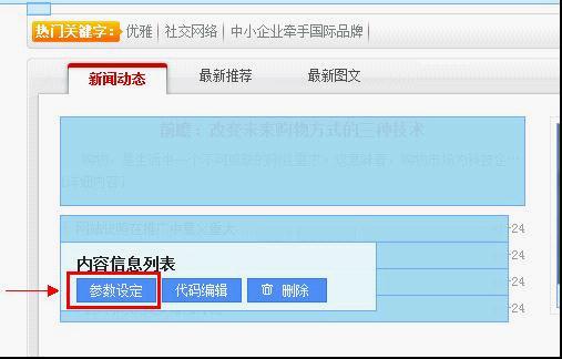 系統(tǒng)后臺進入模板可視塊編輯頁面,鼠標移動到需要修改標簽參數(shù)的模塊上,頁面即出現(xiàn)“參數(shù)設(shè)定”選項,點擊出現(xiàn)標簽參數(shù)修改框,修改后可在界面中看到實際效果。