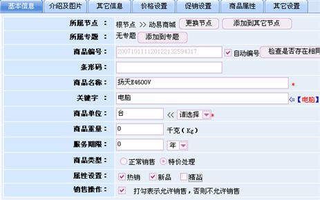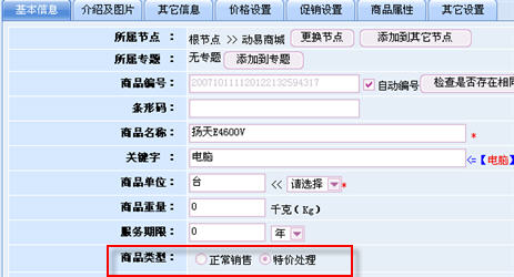 另外,除了這五種銷售狀態(tài)外,動易eShop2007還可以設置正常銷售和特價商品和這兩種銷售狀態(tài),這是從價格管理上來區(qū)分的。這個可以在后臺“添加商品——基本信息——商品類型”中進行勾選,