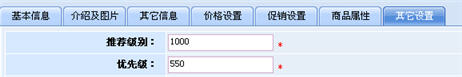 “推薦級別”對應前臺的推薦商品,“優(yōu)先級別”則對應前臺的固頂商品。因為動易eShop2007的默認模板是設置了通過前臺調用標簽的方式來顯示推薦商品和固頂商品的,所以推薦級別和優(yōu)先級別的最小設置數(shù)可以由用戶自行在標簽里進行設置;如果用戶是自行設計模板的話,也可以選擇直接顯示而不通過標簽調用的方式在前臺顯示。在動易eShop2007默認模板里,推薦級別和優(yōu)先級別的設置數(shù)量分別是大于99和大于500,也就是說,當在推薦級別或優(yōu)先級別一欄填寫了大于99或者大于500的數(shù)字時,該商品將自動在前臺推薦商品或固頂商品一欄中顯示。