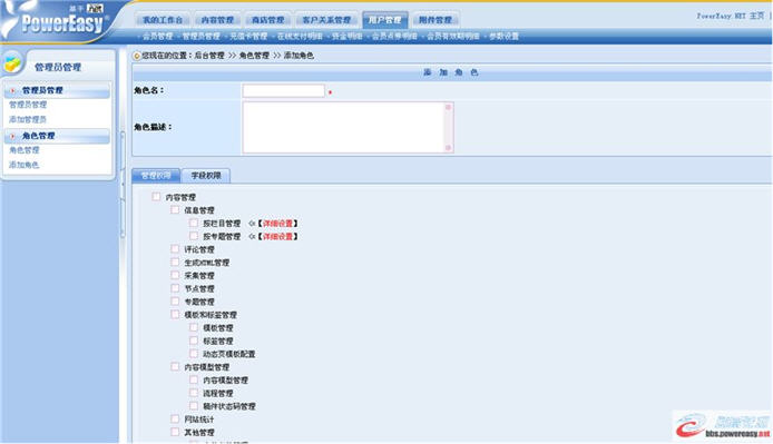 動易CMS 2007的權(quán)限管理實現(xiàn)了標準RBAC模型。RBAC(基于角色的訪問控制)就是實現(xiàn)了兩組多對多的對應(yīng)關(guān)系(即用戶<->角色、角色<->權(quán)限),從面使用戶和權(quán)限分離,以便簡化權(quán)限管理操作。在動易CMS 2007中,一個管理員可以屬于多個角色,而且每個角色都可以獨立設(shè)置權(quán)限,這樣就極大地提高了權(quán)限管理的靈活性。用戶部分的權(quán)限是通過用戶、用戶組和權(quán)限來進行控制的,而且對權(quán)限進行了細化,在方便操作的同時提供了更多的可控性,加強了對網(wǎng)站用戶的管理。