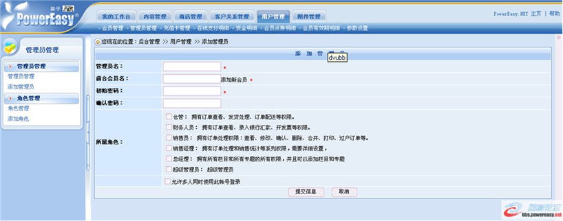 在動易CMS 2007后臺管理員管理下面我們可以看到新增了“角色管理”和“添加角色”的按鈕?!敖巧保瑒右證MS 2007一個全新的概念。那么,什么叫做角色呢?它又在動易CMS 2007里起著怎樣的作用呢?