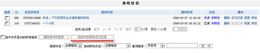用戶點(diǎn)擊“查看接收的短信”功能鏈接后,在出現(xiàn)的右側(cè)頁(yè)面中可以看到回復(fù)短信所發(fā)送的號(hào)碼、接收的時(shí)間、短信內(nèi)容和四個(gè)短信操作功能:刪除、設(shè)為已讀、回復(fù)和轉(zhuǎn)發(fā)。對(duì)于用戶已經(jīng)閱讀過(guò)的短信,系統(tǒng)會(huì)自動(dòng)將其設(shè)置為已讀狀態(tài),這樣就不再需要人工再次的處理。如圖2: