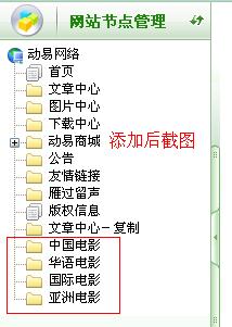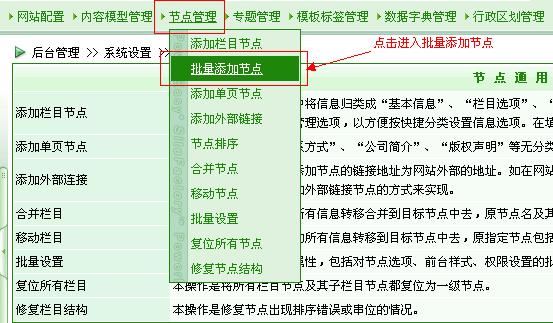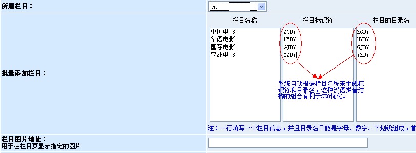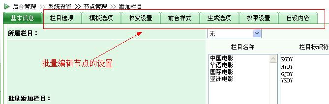 點擊“批量添加節(jié)點”后進入“節(jié)點批量增加”界面,每行為一個節(jié)點(如圖中所示:中國電影為一個節(jié)點、話語電影為一個節(jié)點…),值得一提的是,系統(tǒng)會自動根據(jù)欄目名稱來生成標識符和目錄名,這種漢語拼音結構的組合形式有利于站點的SEO優(yōu)化: