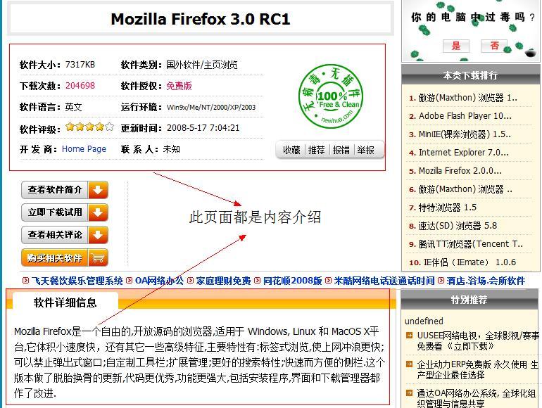 新的生成方式是這樣的:所有的內(nèi)容頁面都可以生成靜態(tài)頁面,只有當(dāng)用戶需要查看包含權(quán)限限制或者收費內(nèi)容時,才會鏈接到動態(tài)頁面進行權(quán)限的判斷。舉個例子:很多專業(yè)的下載站點都采用了此種方式,如華軍、天空等。當(dāng)我們打開某個軟件的介紹頁面后(實際就是內(nèi)容頁),在頁面中可以查看到此軟件的各種介紹、截圖等等(圖1)。當(dāng)我們確定需要下載后才需要點擊下載鏈接進行權(quán)限的判斷(圖2),這樣就大大降低了數(shù)據(jù)庫訪問需求,同時提升了搜索引擎的收錄。