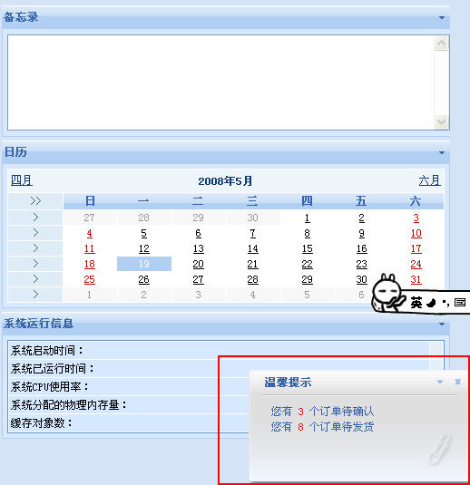 只要再過一兩個(gè)星期,大家就能親自體驗(yàn)這個(gè)功能了:當(dāng)我們安裝完畢SiteFactory CMS/eShop 1.1后,一登錄后臺(tái)就會(huì)發(fā)現(xiàn)有個(gè)提示框從右下角動(dòng)態(tài)彈出,消息框?qū)⑾蛭覀兞谐鲂畔ⅲ耗卸嗌倨恼挛磳徍?、多少訂單未處理、多少發(fā)貨未處理……等等。