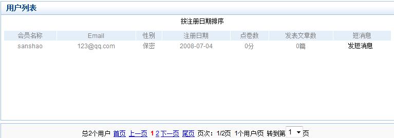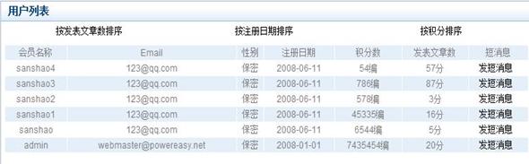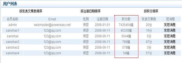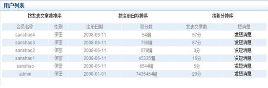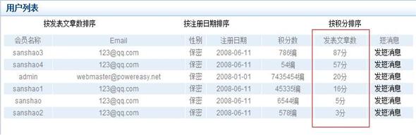 系統(tǒng)默認(rèn)用戶列表頁模板擁有三排行方式:按注冊日期排序、按發(fā)表文章數(shù)排序、按積分排序。