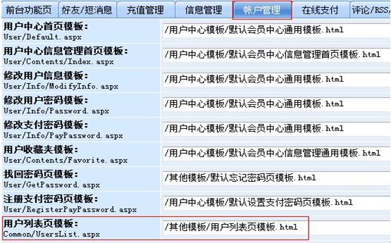 點(diǎn)擊圖片中的紅色框?qū)B接到:虛擬路徑+Common/UsersList.aspx。如要更換模板,則在后臺管理 >> 系統(tǒng)設(shè)置 >> 模板標(biāo)簽管理 >> 動態(tài)頁模板配置