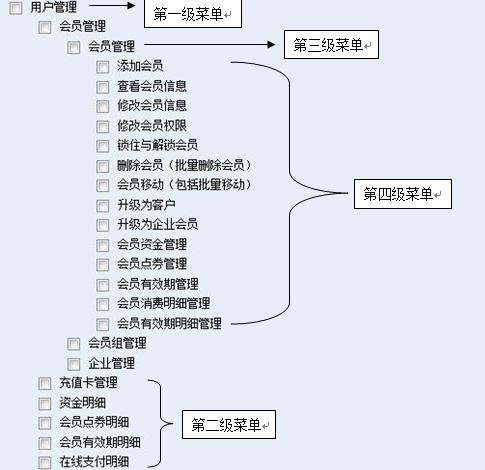 此類權(quán)限往往是對(duì)“大模塊類權(quán)限”的解構(gòu),也就是說“大模塊類權(quán)限”是由一個(gè)個(gè)小模塊類權(quán)限組合而成的。小模塊類權(quán)限往往會(huì)含有三級(jí)甚至四級(jí)的權(quán)限細(xì)分,如下圖中動(dòng)易SiteFactory? 的“用戶管理”權(quán)限就包含有四級(jí)權(quán)限細(xì)分: