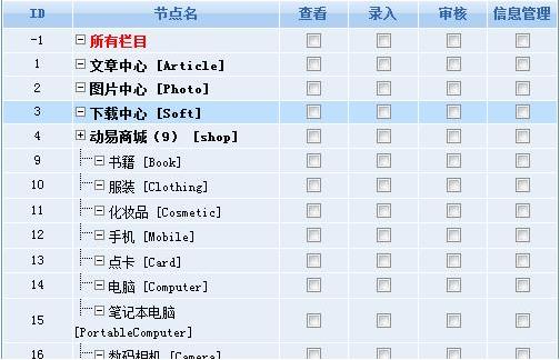 政府、事業(yè)單位、企業(yè)等網(wǎng)站的頻道、專題、欄目都是由節(jié)點(diǎn)來組成,“節(jié)點(diǎn)類權(quán)限”就是對(duì)這些頻道、欄目、專題的訪問、錄入、管理等操作的管理權(quán)限。運(yùn)用動(dòng)易SiteFactory? 可以對(duì)網(wǎng)站所有節(jié)點(diǎn)進(jìn)行管理權(quán)限設(shè)置,并可以細(xì)化到每個(gè)節(jié)點(diǎn)的具體操作。如下圖為動(dòng)易SiteFactory? 默認(rèn)節(jié)點(diǎn)的權(quán)限設(shè)置: